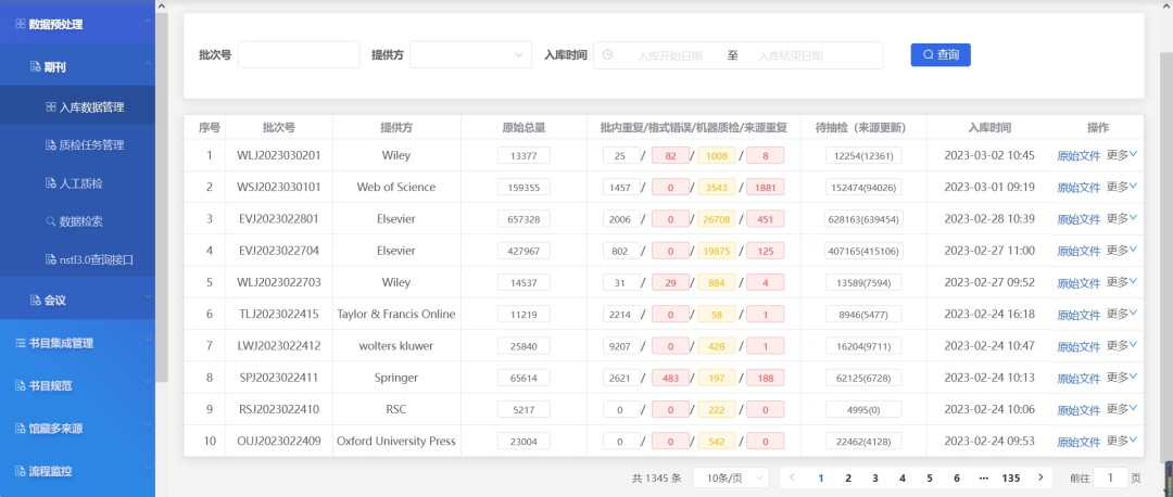 文献元数据集成管理系统所管理的文献类型包括期刊、会议、图书、课件、科技丛书、文集汇编、学位论文、科技报告、专利与标准等,对这些多类型文献的数据进行解析、查重、质检,建立第三方来源的元数据预处理库,在此基础上建立母体数据的采集、规范、归一、融合流程,实现多来源印本母体数据与电子资源等母体数据等的统一管理、以及不同类型数据之间的关联耦合。