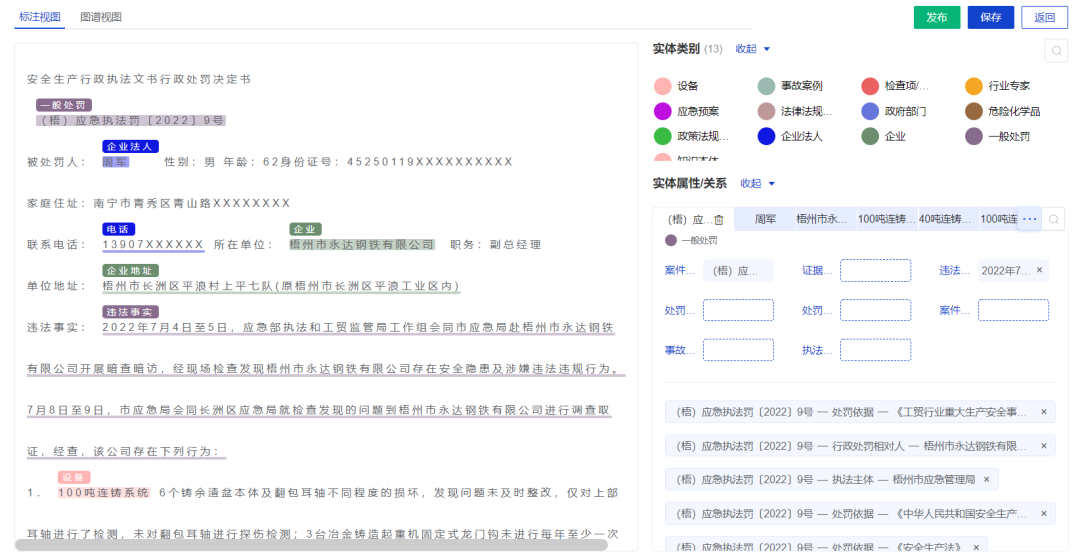 依托应急部危化、工贸等企业重点设备的检查项、法律法规、事故案例等数据资源,梳理安全生产执法检查业务流程和数据,构建智能执法知识图谱,为执法检查业务提供知识服务能力的支撑。