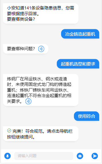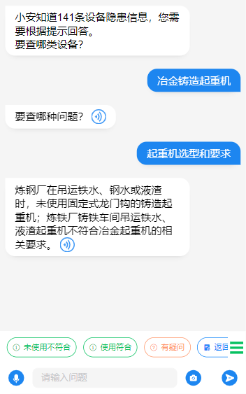 面向工贸、危化等重点行业领域,提供设备隐患信息引导式问答服务,用户可根据引导快速完成设备隐患筛查。